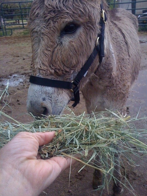 I had considered bringing donkeys here for some years, thinking they might keep the coyotes away from the mini-horses, chickens and other assorted fowl. Coyotes have been rough on our chicken population, grabbing hens when they come down from the trees and leaving our favorite rooster’s head lying on an irrigation berm, tragically divested of its body. We try to keep the chickens in coops at night but one slip-up, one missed night, and bang, the coyotes dine again.